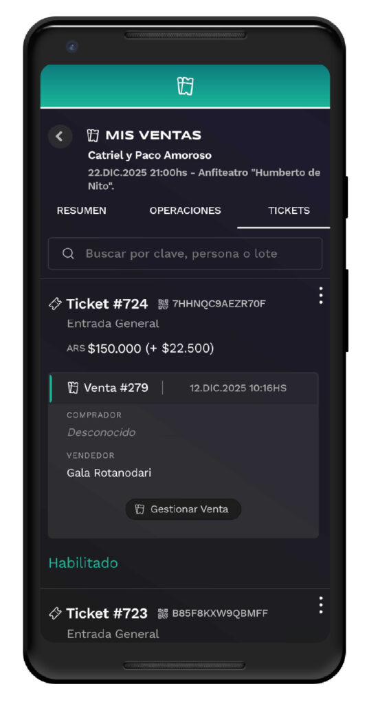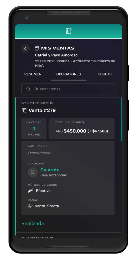 Esta sección permite realizar consultas o acciones sobre las ventas ya concretadas. Cada operación está identificada con un número único, y dentro de cada una se podrán visualizar los tickets vendidos, el importe total y el método de pago utilizado. Si la venta ha sido personalizada, será posible identificar al comprador y contactarlo directamente por llamada o WhatsApp.