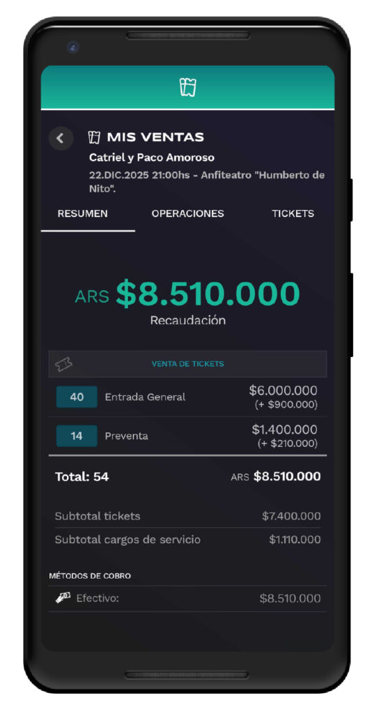 En esta pestaña, los vendedores pueden monitorear la evolución de sus ventas en tiempo real. Tendrán acceso a la cantidad de entradas vendidas y las recaudaciones obtenidas por cada lote de tickets. También podrán ver qué métodos de cobro se han utilizado, como ventas en efectivo o con tarjetas de crédito/débito, y cuánto dinero se ha recaudado por cada uno.