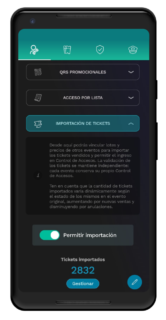Se incorporó un nuevo método de acceso “Importación de Tickets”, que permite vincular lotes y precios de otros eventos para importar los tickets vendidos y habilitar su ingreso a través del Control de Accesos sin necesidad de generar nuevas entradas.
